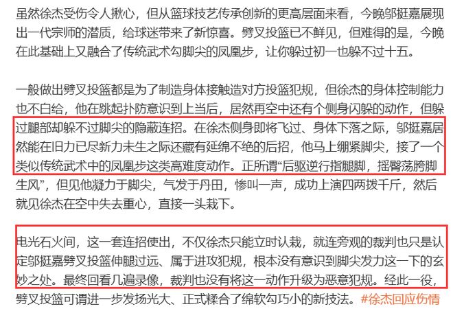 文章中指出,徐杰在空中有一個側身躲避動作,但鄔挺嘉卻能在“舊力已盡新力未生之際還藏有延綿不絕的后招,他馬上繃緊腳尖,接了一個類似傳統武術中的鳳凰步這類高難度動作”,這一招隱蔽的腳尖發力勾腿動作騙過了裁判,讓裁判只能認定將其認定是普通的劈叉投籃伸腿過遠,屬于進攻犯規。