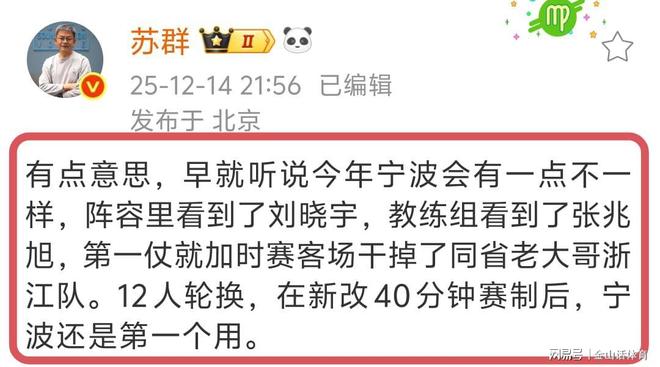 “平民球隊”擊敗CBA老牌勁旅,賽后著名籃球記者蘇群,在個人媒體平臺寫道“有點意思,早就聽說今年寧波會有一點不一樣,陣容里看到了劉曉宇,教練組看到了張兆旭,第一仗就加時賽客場干掉了同省老大哥浙江隊。12人輪換,在新改40分鐘賽制后,寧波還是第一個用。 ”。